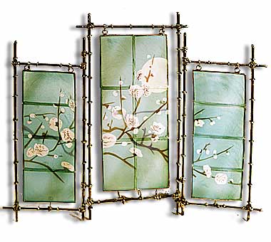 Three hinged screens of shell art. Stand in front of a pillar candle for a stunning and flickering glow.