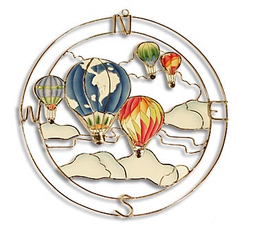 Vibrant hot air balloons drifting over the continents. Note the compass points on the frame.