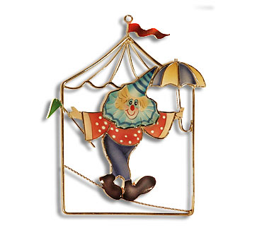 Our circus clown is walking a tightrope and holding an umbrella to cushion his fall.