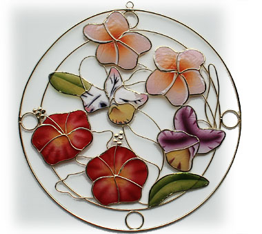 A beautiful, colorful example of assorted flowers in a circular form. Ideal as a window suncatcher or mirror art with included suction cup hanger.