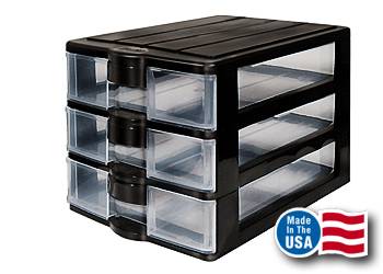 3 shallow slide-out drawers with handles are durable clear plastic for good visibility of contents. Molded heavy plastic frame.
